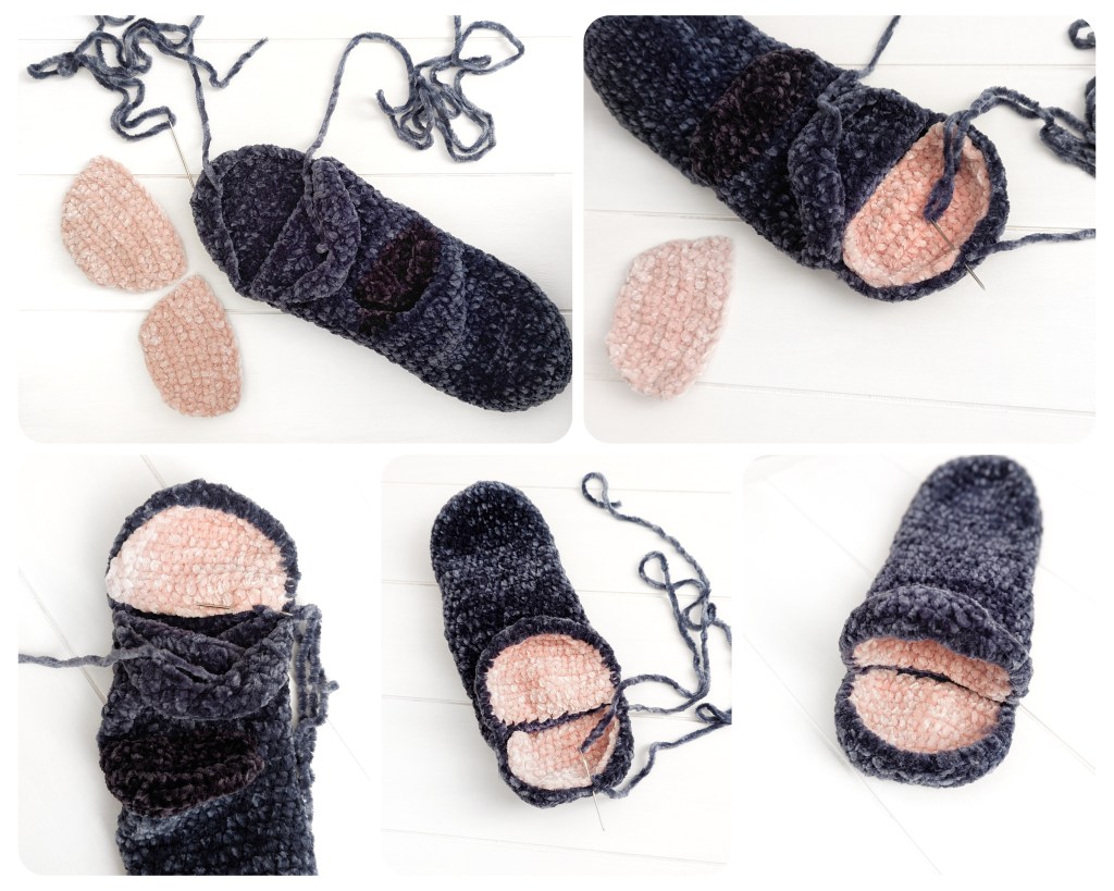 Instead of multiple appliqués, you can also crochet a sole that extends from the heel to the toes using sturdier yarn, which can then be sewn onto the outside of the sock or slipper like a shoe sole. This adds a special look and more security.