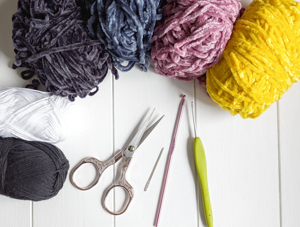 - Additionally, thin, sturdy yarn for the eyes, horns, and teeth, e.g., sock yarn. I used Rainbow Deluxe 8/4 by Hobbii (2.5 – 3 mm recommended hook size) with a 2.0 mm crochet hook.