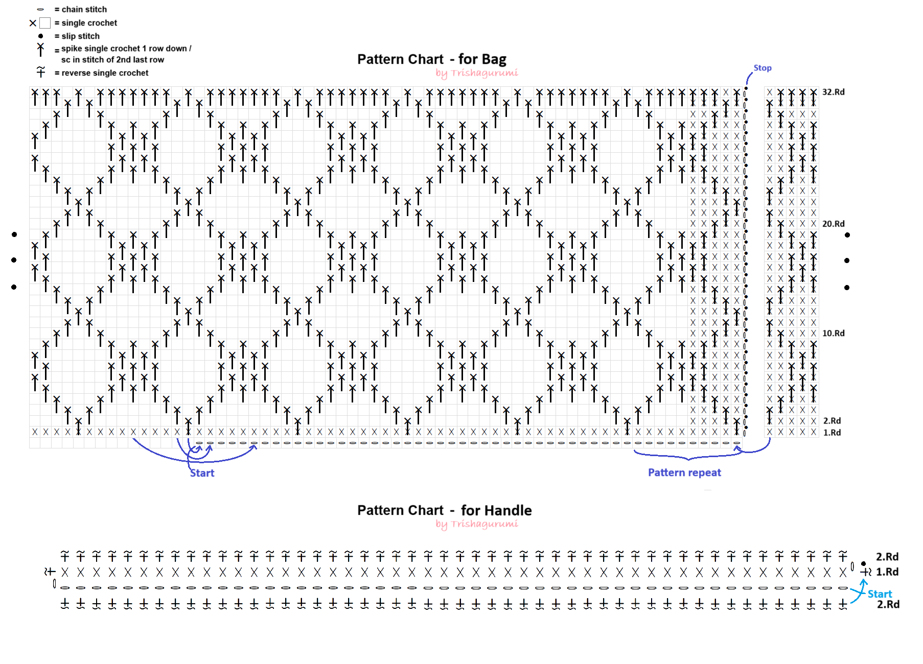 - Start with 50 chain stitches (30 ch for raffia yarn). Crochet 1 single crochet in each chain stitch around on both sides of the chain, then 32 rounds in the pattern design below.