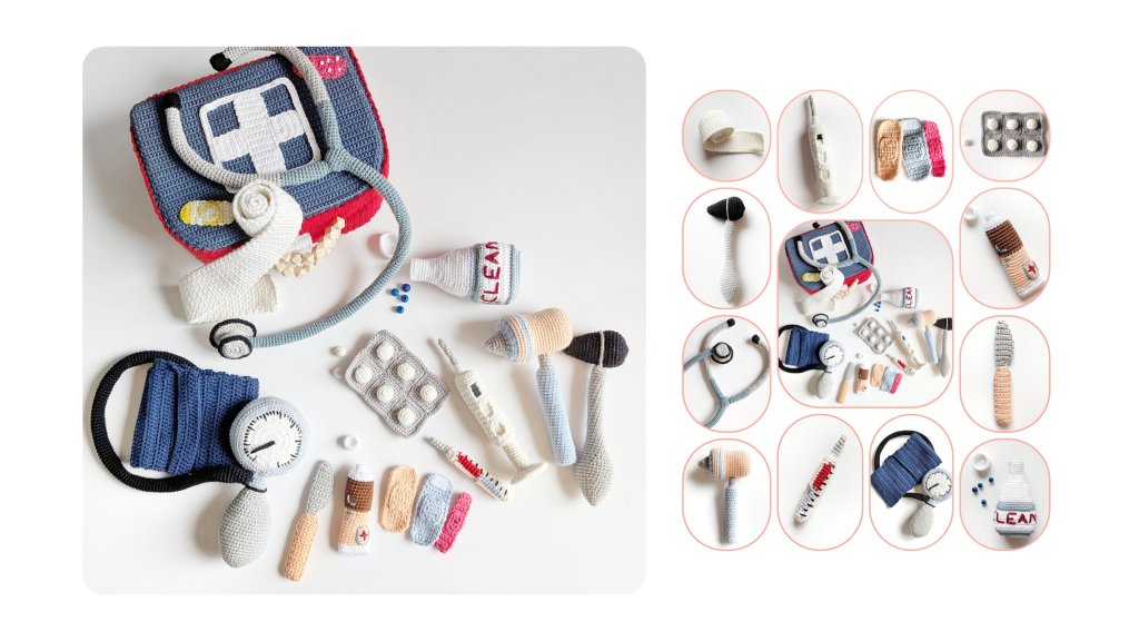 Once finished, you’ll have a fully equipped crochet doctor’s kit that’s perfect for pretend play, decoration, as a fun gift for a loved one in the medical field or simply as a cute keepsake. The pattern set is designed for those who want to create a handmade toy that’s as realistic as it is fun.