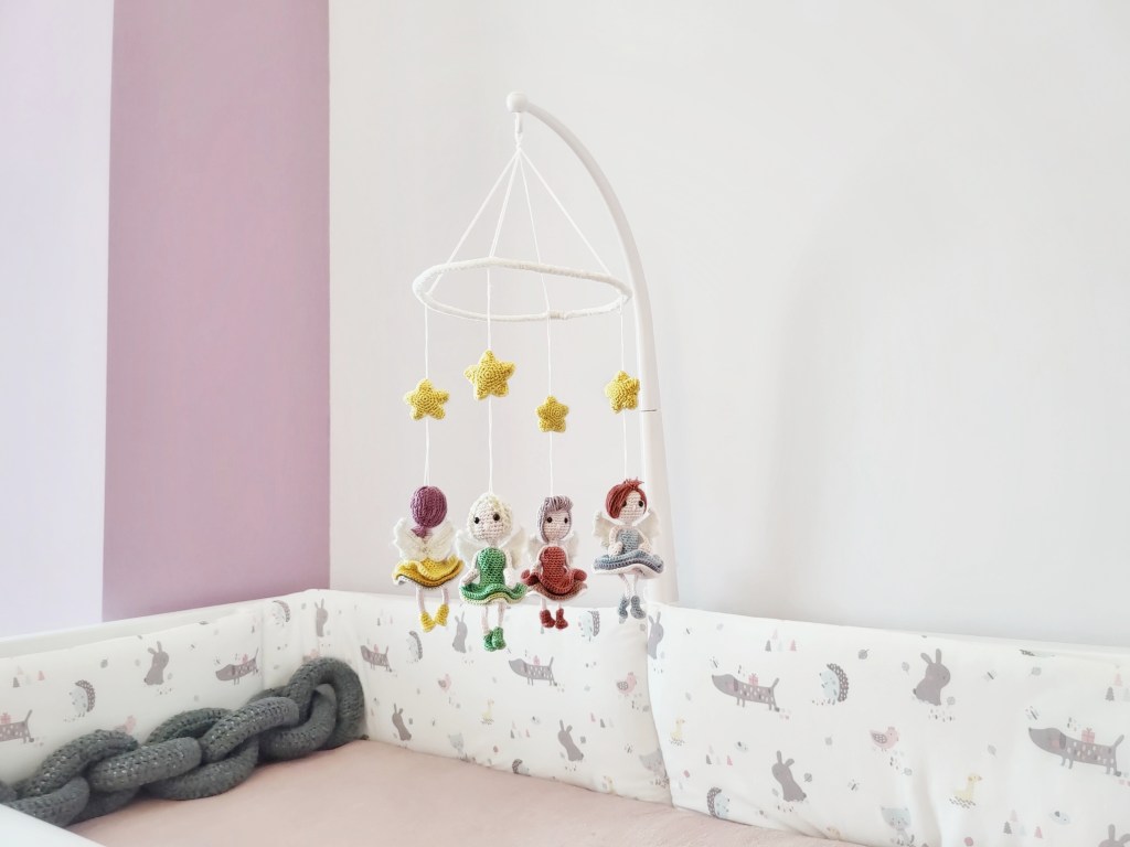 The crochet fairy mobile consists of 4 fairies and stars made of 100% cotton (except for the hair in two fairies and the crochet cover of the mobile ring which is made of polyester). The fairies differ in dress shades and hair style, so that each of them becomes a very unique fairy to watch over your little bub. Each crochet fairy has a length of about 13 cm. As such they fit perfectly in the little hands of your baby, but are still big enough to not be swallowed. Be creative with the colours of the dresses, from earthy to bright and hip – how your little one likes it best! You can spin the crochet mobile by twisting the top of the ring (hanger loop) several times. The mobile then spins back and forth until it comes to a rest.