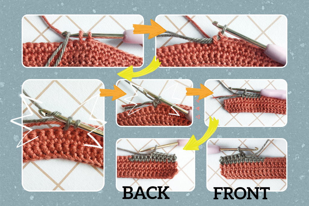 To create clean color transitions, complete the last yarn-over of the last stitch in the old color using the new color. Crochet over the yarn end of the previous color as you go to avoid weaving in ends later.