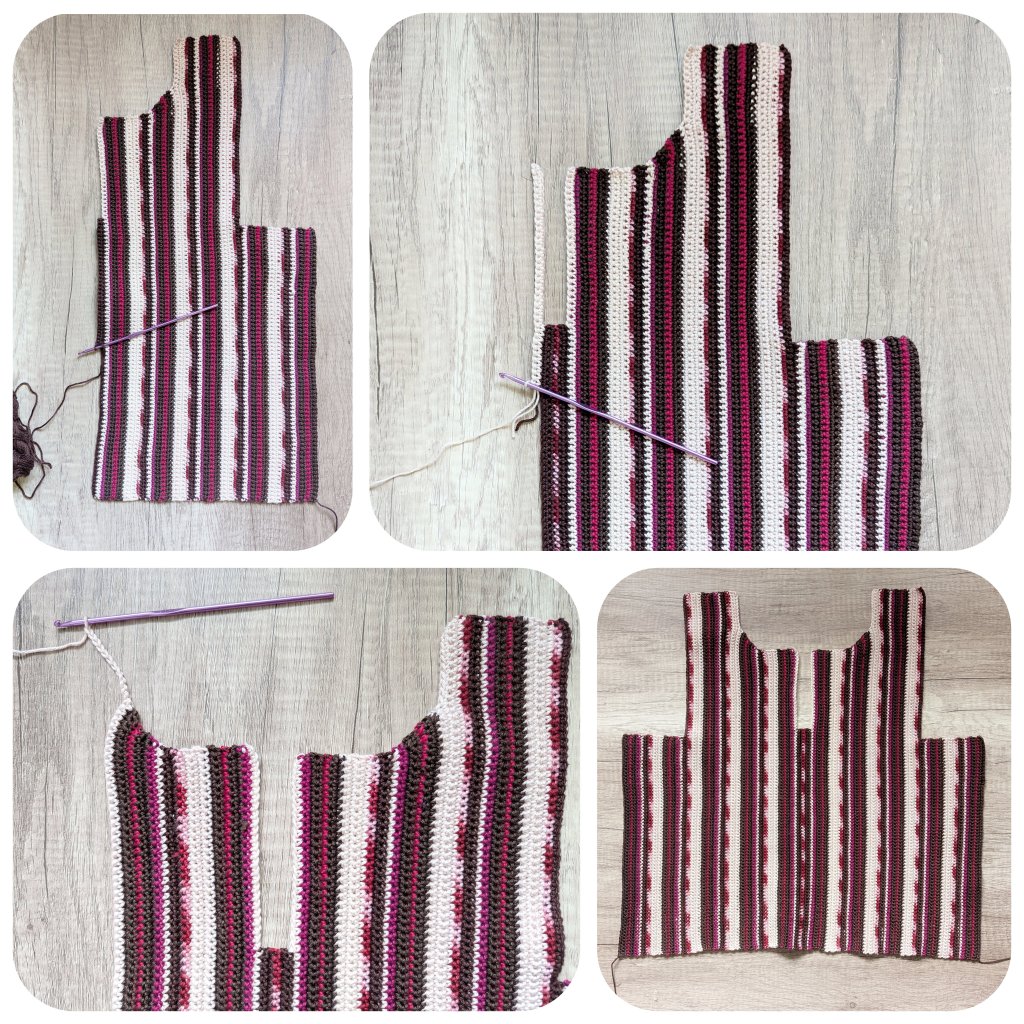 - For the armhole, after 7.5 cm = 22 rows from the beginning, chain an additional 47 (49) ch + 1 turning chain on the right edge. Continue working across all 115 (117) sts following the same color sequence.