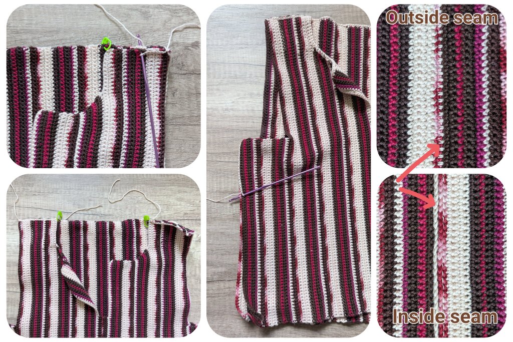 - Use the lightest yarn color (Powder Pink) and slip stitch the pieces together on the wrong side (this way, only the connecting seam is visible from the outside, not the slip stitches themselves).