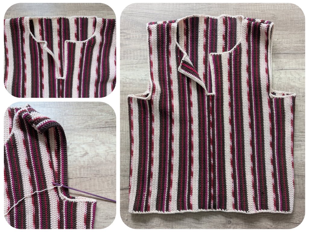 - After 7.5 cm = 22 rows from the start of the armhole (or 5 cm = 14 rows from the start of the decreases – this corresponds to just before the chest center), leave 25 sts unworked in the center to form the slit. After 3 rows, reverse the color sequence (do not repeat the last row). After 2 more rows, crochet the previously left 25 sts again in the next color and continue the mirrored color pattern (Row 3 of the slit marks the point where the color pattern flips).