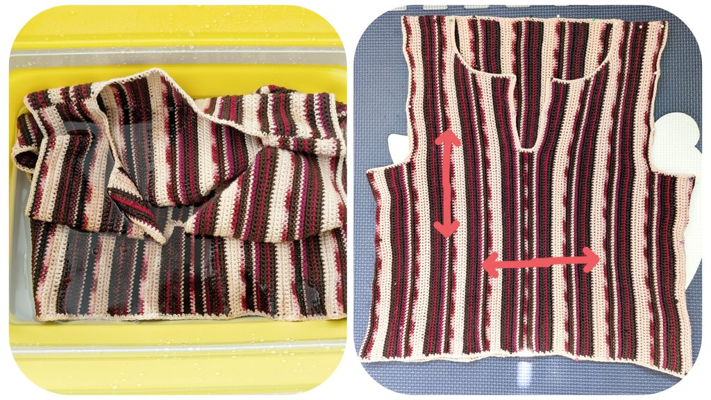 After washing, roll the top in a towel and gently press out the excess water (do not wring). Then shape it on a soft surface (such as a blocking mat, foam pad, or yoga mat) and pin it in place with sewing pins. Focus on stretching it more in width than in length so that the tight stitches gain a slightly stretched structure. This makes the top drape more casually and gives the stitches a looser appearance.