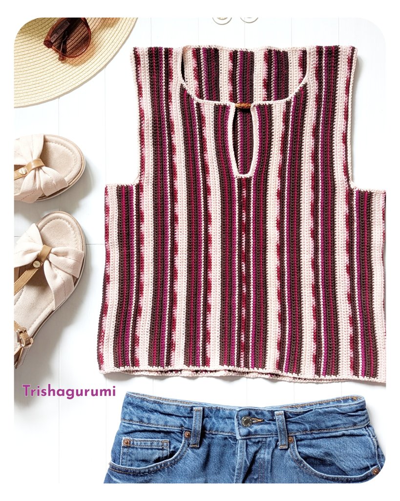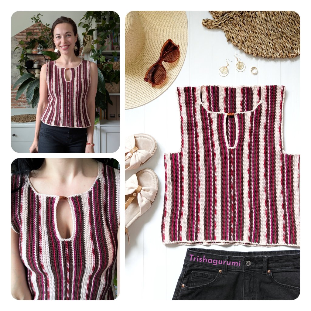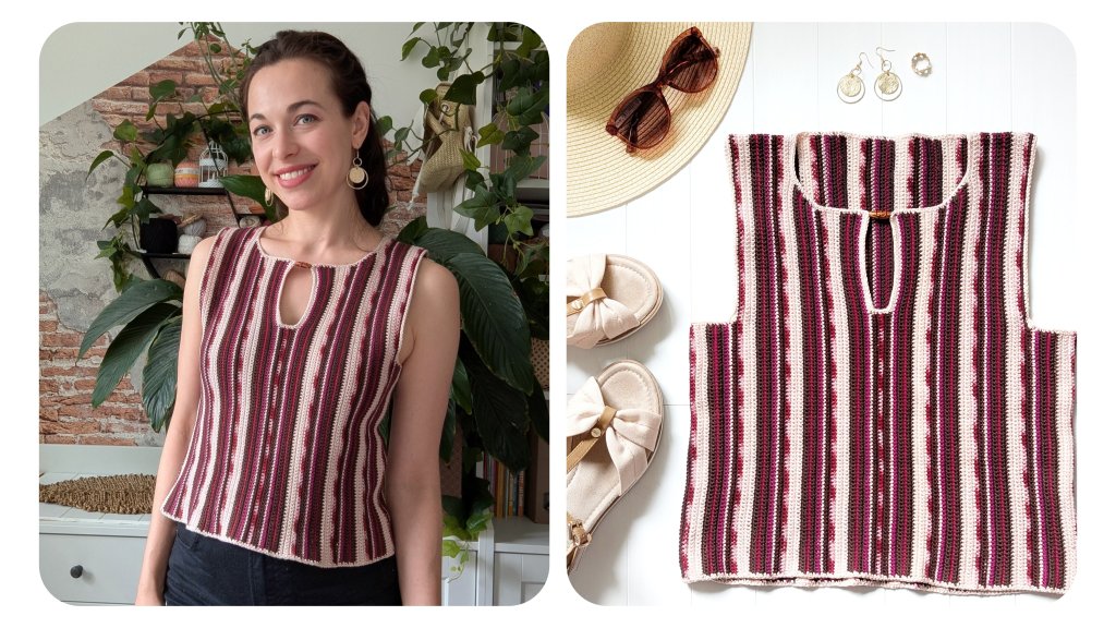 For my version, I chose a harmonious color combination of red, brown, and beige tones. The fine stripes add a lively touch to the design without being too bold. These colors pair beautifully with classic jeans – whether black or blue – making this top super versatile and even office-appropriate. Thanks to the use of cotton yarn, it’s perfect for hot summer days. You could even easily add sleeves if you like.
