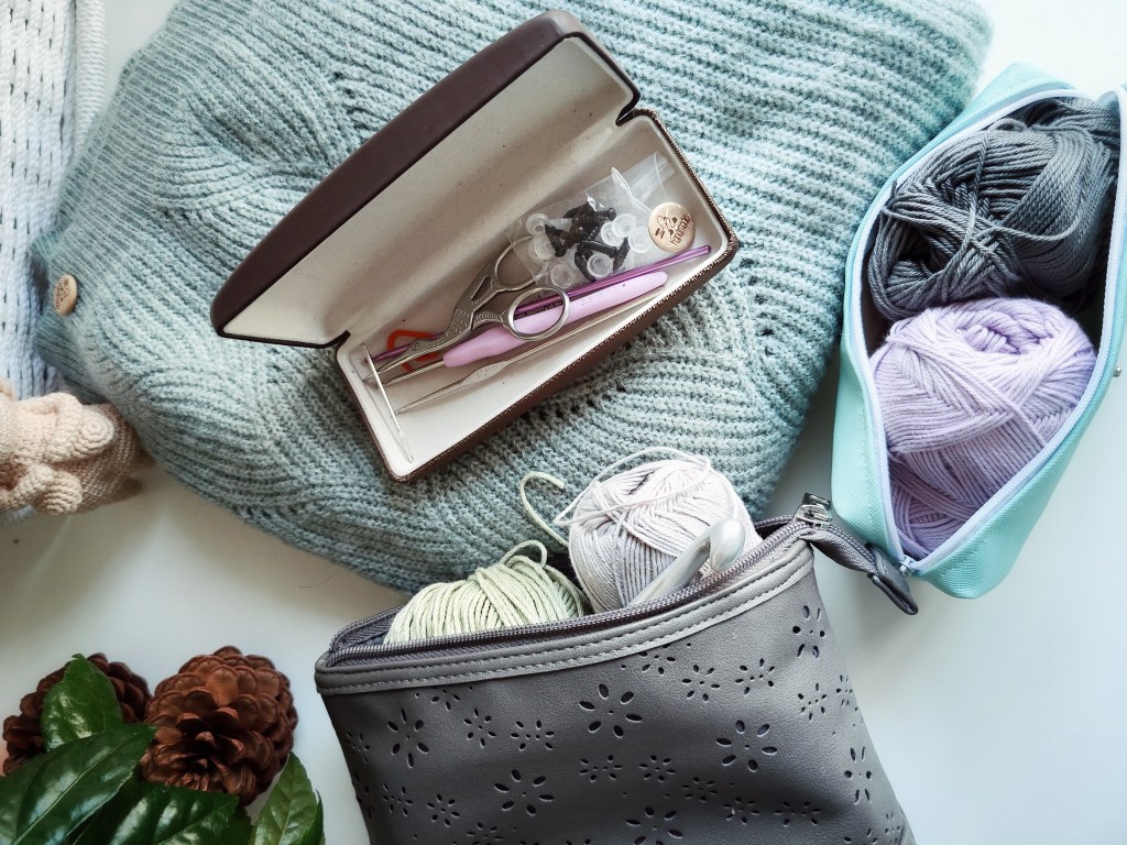 If you want to have your crochet tools with you when you are on the move, you can simply put the yarn in a chic toilet bag or a pencil case and the small parts (like crochet hook, scissors, wool needle, markers, security eyes, measuring tape…) in a glasses case.