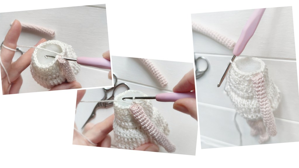 - At the end, skip the slip stitch from the round start (2.) and work a slip stitch in the last chain stitch (skipping any other chain sts in-between).