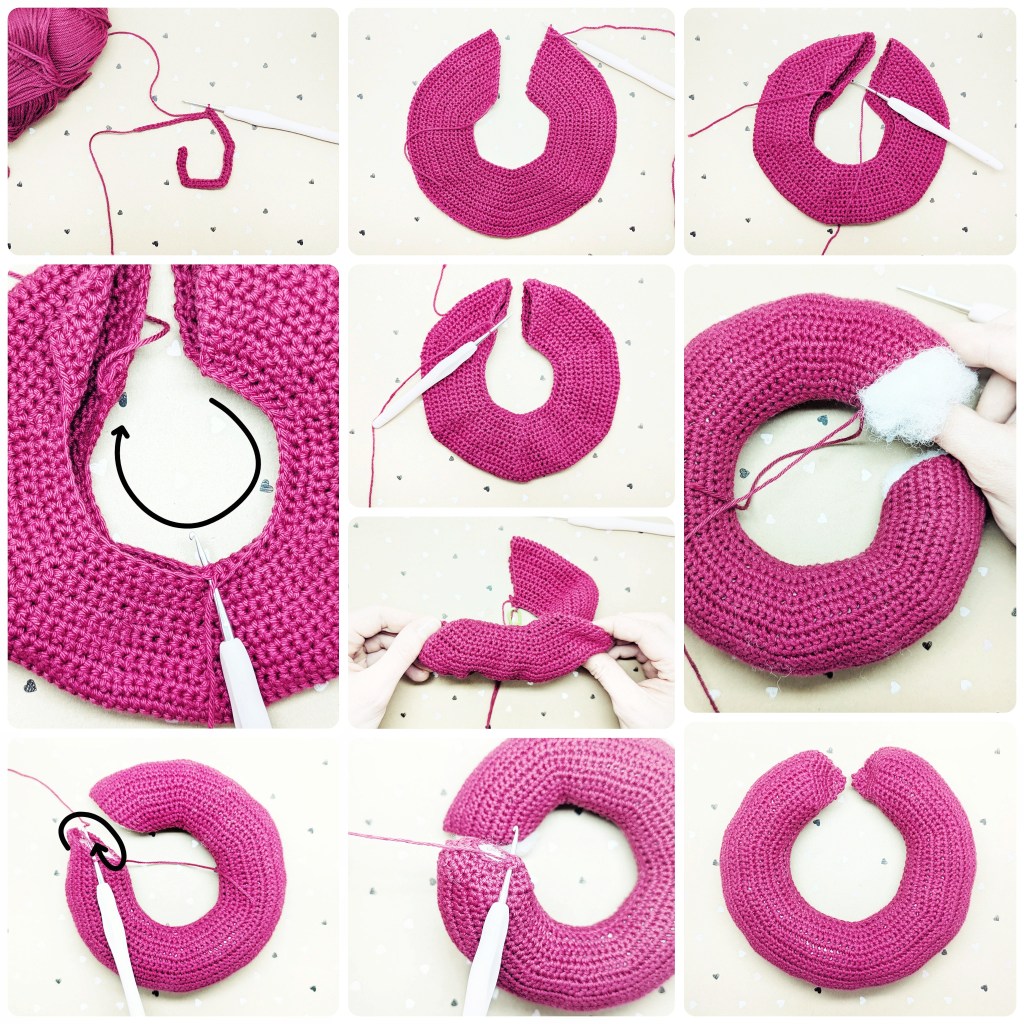 You can find the free pattern for the Donut Neck Pillow from the pictures here.