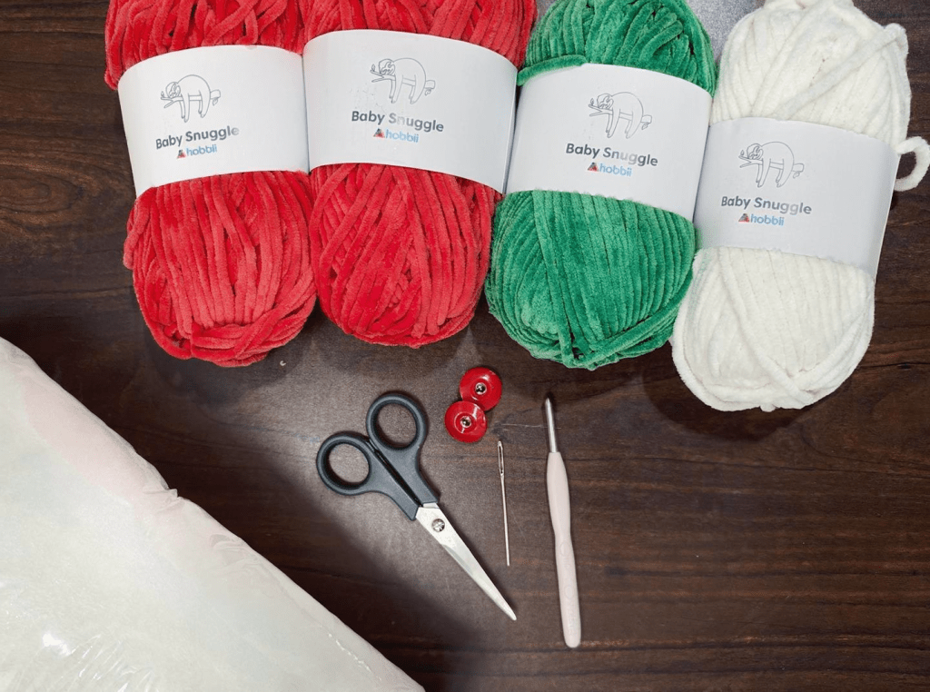 • Super Bulky chenille yarn in red (appr. 200 m), green (appr. 60 m), white (appr. 20 m)