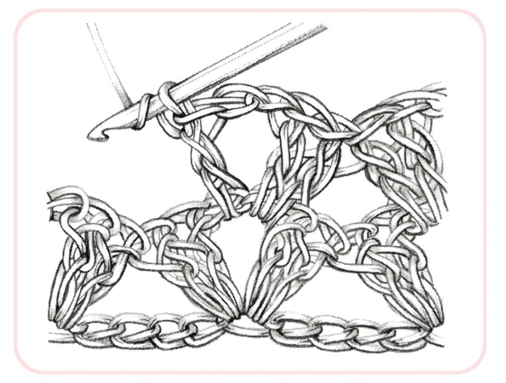 1. Rd (=27. Rd…): 1 sl st in next 3 ch sts, change colour to net-colour (rose). Ch 11 (count as 1 tc and ch 8), (1 sc in next ch-5 sp, ch 8, 1 tc in next ch-5 sp, ch 8) x 5, 1 sc in next ch-5 sp, ch 8, 1 sl st in 3rd ch of next ch-11 sp.