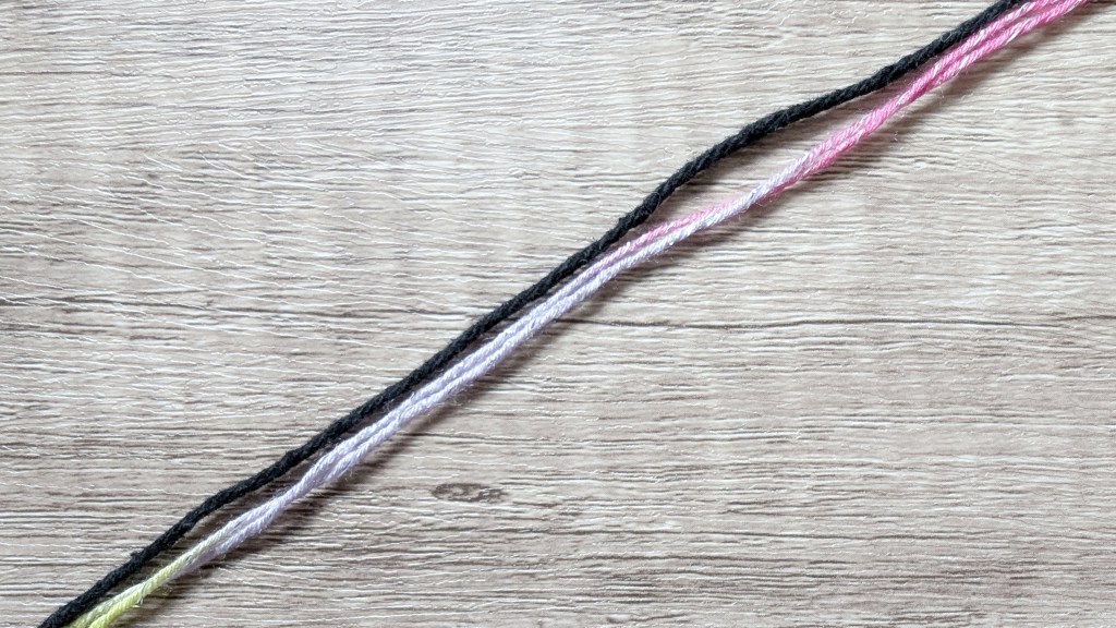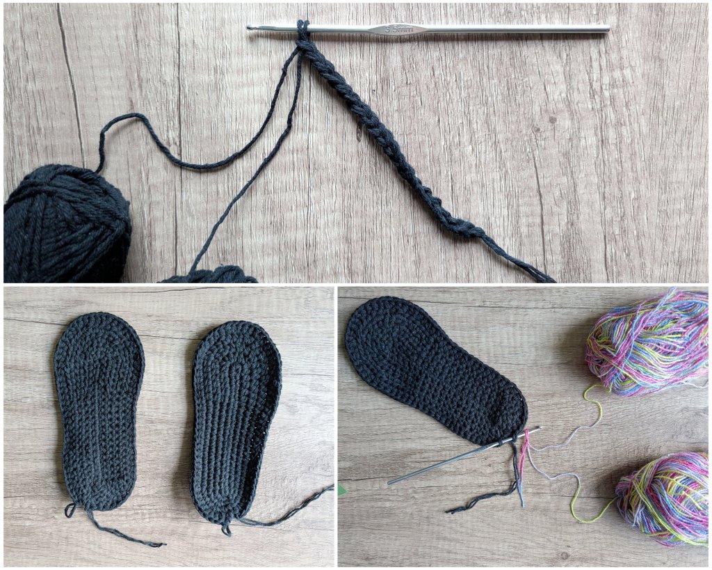 For one pair of children’s slippers, one skein of yarn each for the sole and the upper is enough. Both the sole and the upper are crocheted with a double strand – you can simply use the starting strand from inside the skein together with the strand from the outside.
