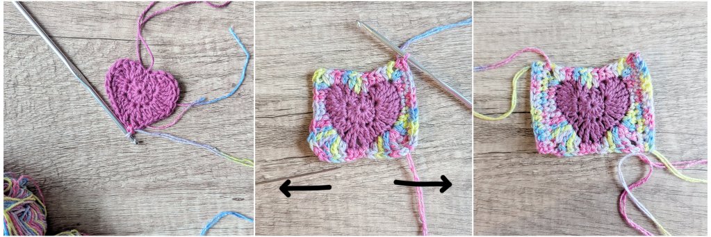 Good options are a traditional granny square or this floral granny square (crochet only up to Rd 6, using ch 2 at corners instead of ch 3). I used this heart granny square from Adore Crea (without Rd 4) because my daughters love hearts. Essentially, any other pattern can be used as well.