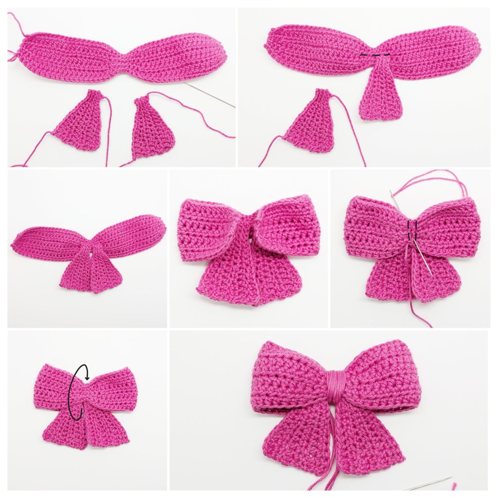 The bow consists of 3 parts: the main bow piece and 2 ties. All parts are worked in rows.