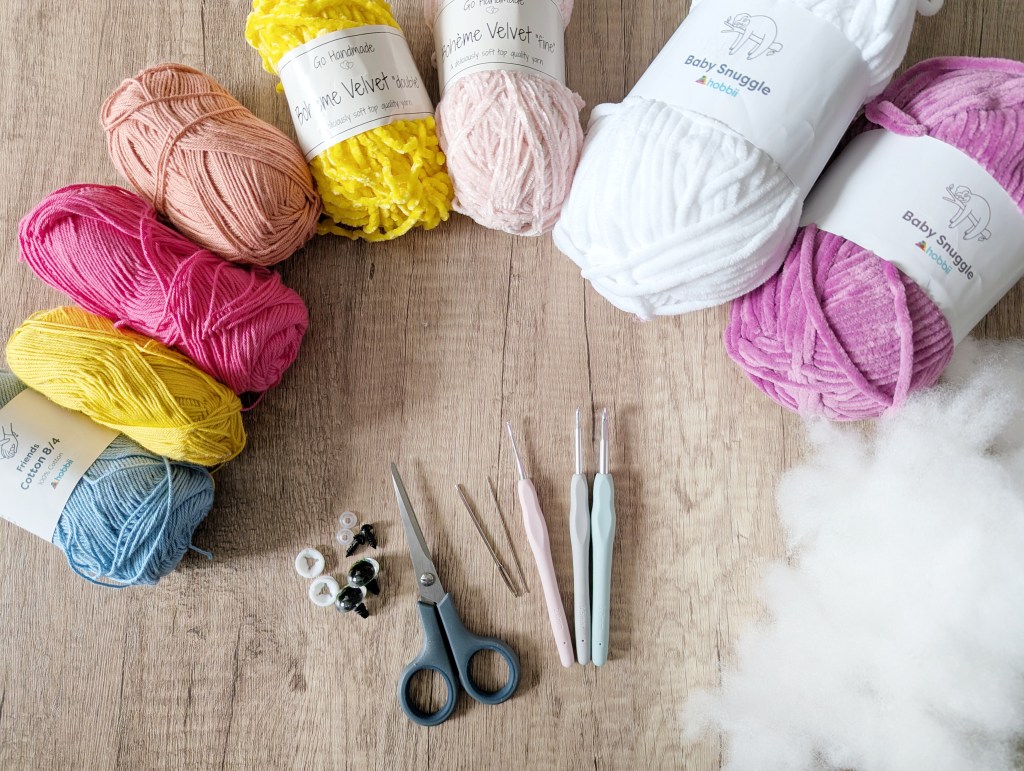 - For the chick: medium velvet yarn in yellow (appr. 40 m) and super fine cotton yarn in several colors (up to 20 m)