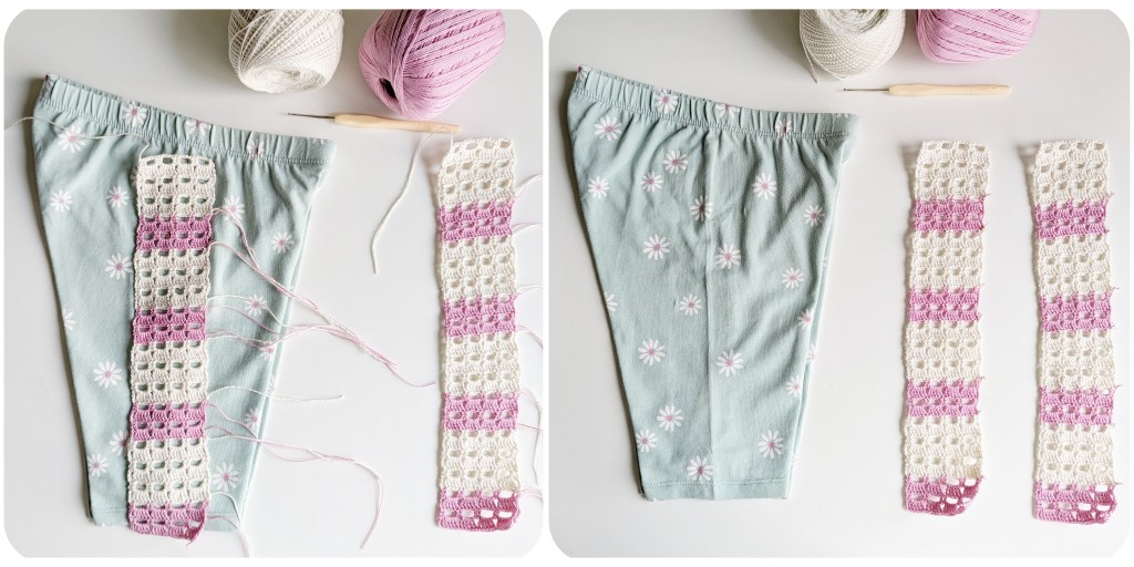 - The crochet band starts right from below the waistband and aligns with the bottom of the legs. For thicker shorts, you can crochet a 1 cm longer band to fold this 1 cm at the bottom for finishing.