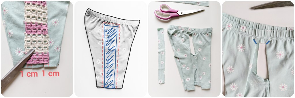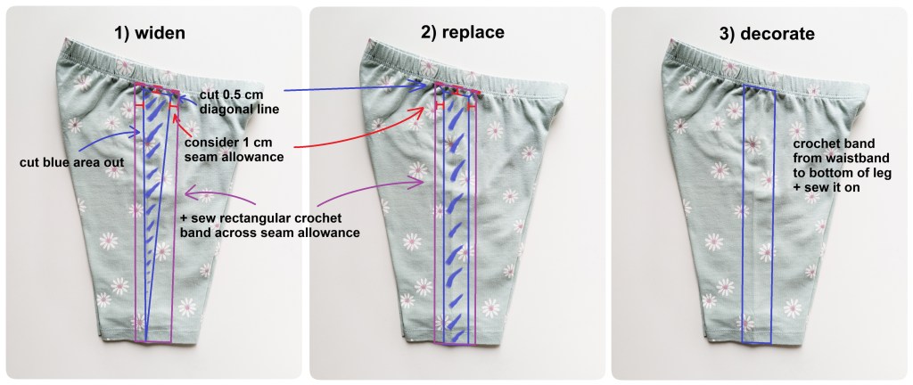 1) you want to widen the shorts’ legs: in this option you need to cut the shape of an isosceles triangle out from each side of the shorts, whereby the tip of the triangle is positioned at the bottom of a leg and the base of the triangle goes along 1 cm below the waistband (this 1 cm corresponds to the seam allowance). When cutting the triangle, consider 1 cm seam allowance along the sides. So, if the triangle is 3 cm wide, the crochet band should be 5 cm wide (3 cm + 1 cm per side). Then, you crochet the side band in rectangular shape and sew the edges along the 1 cm allowance of the sides and the waistband.