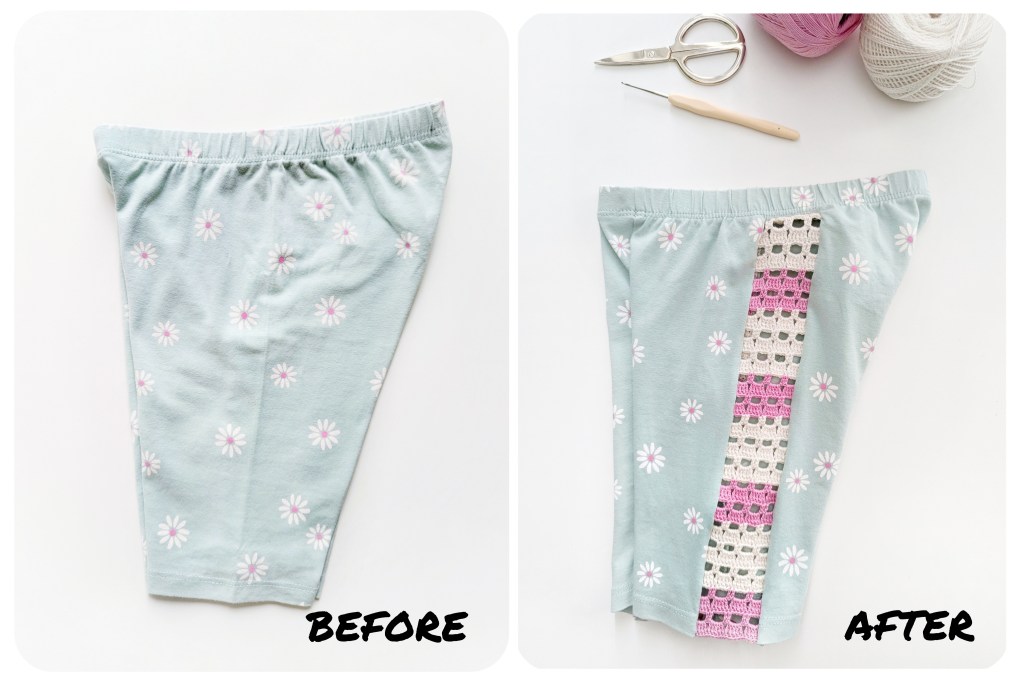 3) you want to keep the shorts as unchanged as possible and just add a bit of crochet elements to improve its look: crochet the rectangular band and sew it along the sides. You don’t need to consider any seam allowance or cut fabric away like in 2).