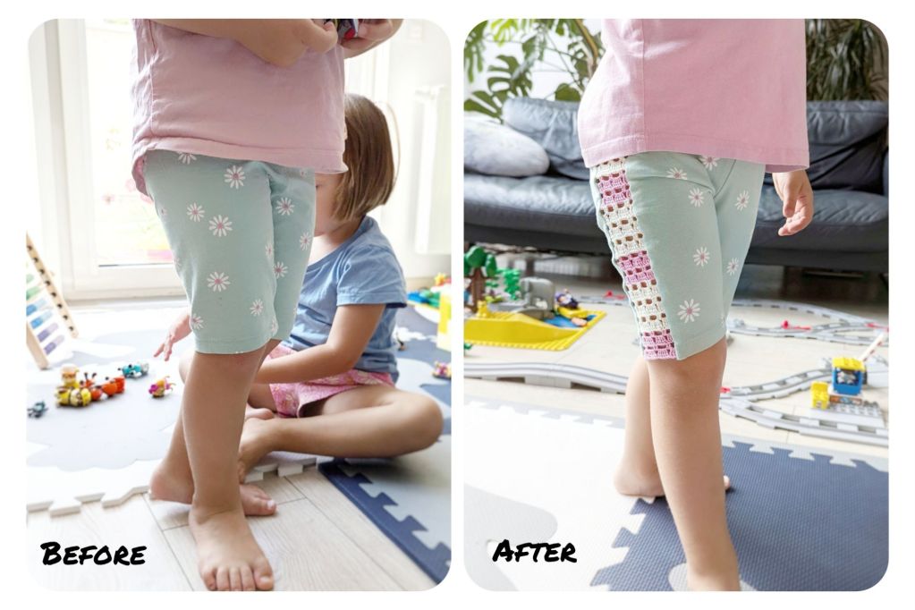 Use preferably shorts with sturdier fabric, like linen or thick cotton. In the illustrations shown, I used the shorts of my girls that are made of jersey. As jersey is very soft, it made the sewing a bit more challenging, but I think it still turned out quite nice after all. As jersey shorts are typically tight-fitting, the size of the crochet band should only minimally change the width of the legs.