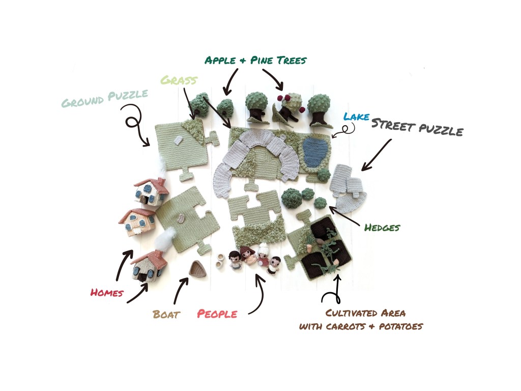 The Crochet Puzzle City Pattern consists of 57 pages of detailed instructions and illustrations for the following elements: